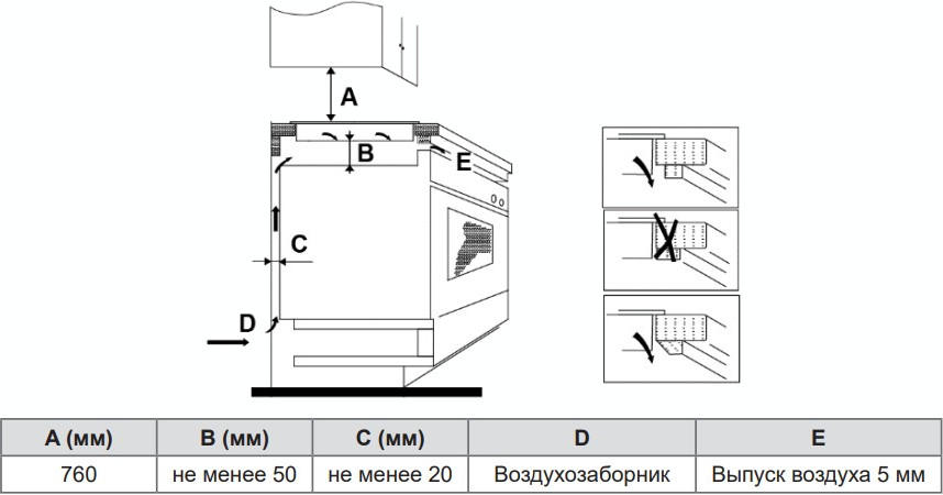 Также опасно устанавливать варочную панель вплотную к холодильнику или шкафу: следует оставить между ними расстояние не менее 30 см. Зазор между задней стороной варочной панели и стенкой кухни составляет обычно не менее 50 см для электрических панелей и 70 см — для газовых. Иногда стену кухни защищают огнеупорной панелью.