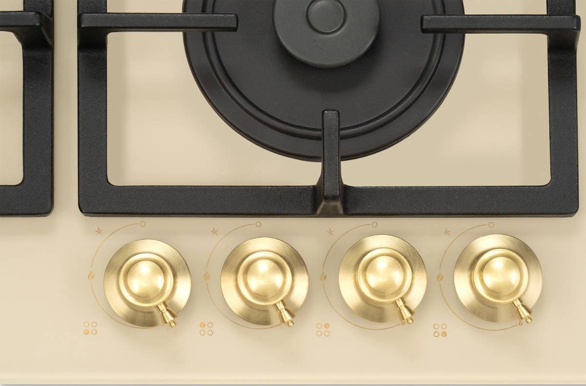 Для варочных панелей в стиле кантри, ампир или классическом характерны латунные ручки из сплава меди и цинка, которые смотрятся благородно и выигрышно. Реже производятся модели, имеющие золотистую или медную фурнитуру.