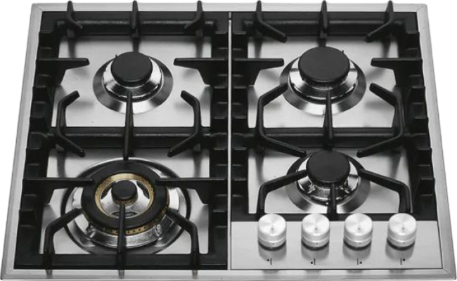 Выбор газовой варочной панели чаще всего обусловлен тем, что в частный дом или квартиру проведен именно газ в качестве обогрева. Работать с этой моделью довольно просто, так как мощность нагрева видна невооруженным взглядом — по силе огня в горелке. Количество конфорок в этой модели: 4. Горелки с тройной короной имеют несколько ступеней нагрева — в зависимости от них образуется несколько кругов пламени.