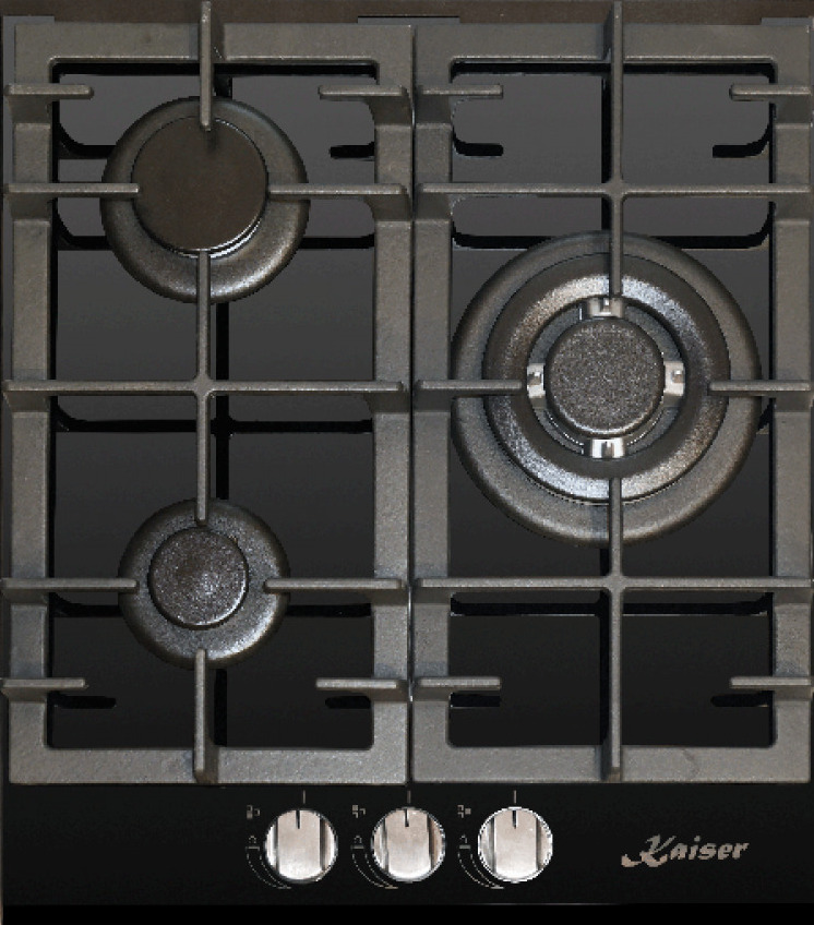 Выбор газовой варочной панели чаще всего обусловлен тем, что в частный дом или квартиру проведен именно газ в качестве обогрева. Работать с этой моделью довольно просто, так как мощность нагрева видна невооруженным взглядом — по силе огня в горелке. Количество конфорок в этой модели: 3. Горелки с тройной короной имеют несколько ступеней нагрева — в зависимости от них образуется несколько кругов пламени.