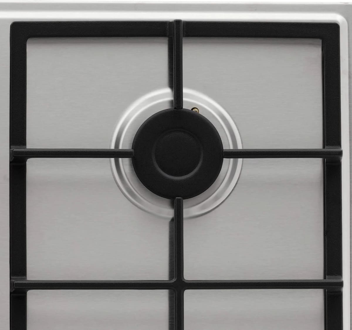 Выбор газовой варочной панели чаще всего обусловлен тем, что в частный дом или квартиру проведен именно газ в качестве обогрева. Работать с этой моделью довольно просто, так как мощность нагрева видна невооруженным взглядом — по силе огня в горелке. Количество конфорок в этой модели: 4. Горелки с тройной короной имеют несколько ступеней нагрева — в зависимости от них образуется несколько кругов пламени.