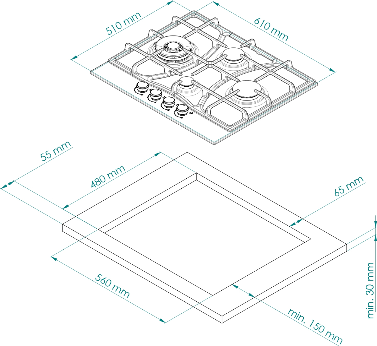 В среднем у газовых моделей этот показатель больше, чем у электрических. Высота газовых варочных поверхностей составляет обычно от 4 до 10 см: важное значение при выборе модели имеет и толщина столешницы. Известно, что стандартная толщина столешницы из ДВП составляет около 38 мм: исходя из этого, высота газовых варочных панелей чаще всего составляет 4–5 см. Если варочная панель имеет большую высоту, ее обычно заглубляют в столешницу, стараясь при этом не повреждать внутреннюю сторону. Для этого под ней устанавливают дополнительную полку (фальшпанель), за счет которой уменьшается пространство в тумбе.