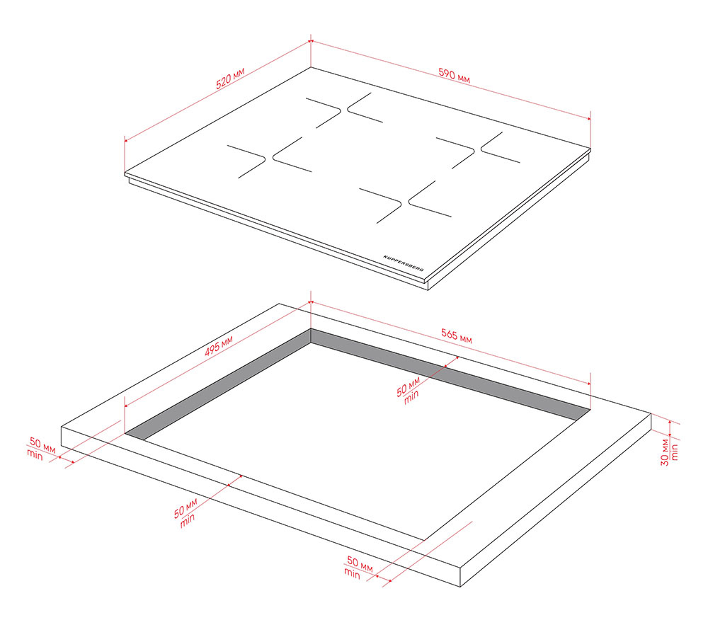 Габариты прибора составляют 6 см в высоту, 59 см в ширину и 52 см в глубину, что соответствует общепринятым стандартам для встраиваемой техники. Такие параметры позволяют органично интегрировать панель в большинство кухонных столешниц без дополнительных сложностей. Для корректного монтажа требуется ниша размером 56 см в ширину и 49 см в глубину, что обеспечивает плотное прилегание, эстетичный внешний вид и необходимую циркуляцию воздуха.