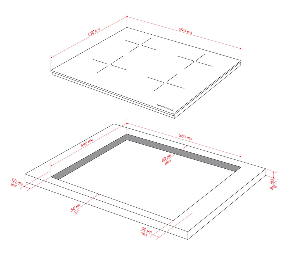 Габариты изделия — 5,8 см в высоту, 59 см в ширину и 52 см в глубину — соответствуют общепринятым нормам для встраиваемых моделей. Такие размеры обеспечивают лёгкую интеграцию в большинство современных кухонных гарнитуров. Для корректного монтажа требуется ниша шириной 56 см и глубиной 49 см, что обеспечивает плотную посадку, эстетичную визуальную интеграцию и достаточную вентиляцию.