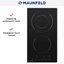 Maunfeld EVSE292FDBK — независимая электрическая варочная панель шириной 30 см с двумя зонами нагрева. Материал изготовления поверхности — стеклокерамика Vitro Ceramic Glass черного цвета, высокопрочная, способная выдержать самую тяжелую посуду — например, чугунные казаны и жаровни. Конфорки Hi-light от немецкого производителя EGO гарантируют очень быстрый нагрев, они мгновенно реагируют на команды, поданные с панели управления. По периметру варочной панели предусмотрена стальная рамка, которая защищает столешницу от попадания пролитой жидкости. Поверхность не имеет выступов и благодаря этому очень удобна в очистке: ее можно протереть одним движением, а для удаления более серьезных загрязнений рекомендуется использовать специальный скребок и средства для стеклокерамики. Благодаря небольшой ширине варочная панель может устанавливаться в малогабаритной кухне; она подойдет для студии, для тех, кто готовит нерегулярно, для семей из 1–2 человек. Электронная панель управления размещается на фронтальной части: регулировка интенсивности нагрева на 9 уровнях производится при помощи слайдера одним движением. Кроме того, панель управления позволяет включить зону расширения для одной из конфорок, активировать автоматику приготовления и запрограммировать таймер на время от 0 до 99 минут — по его истечении конфорка отключится автоматически. Все функции панели управления можно заблокировать от детей.