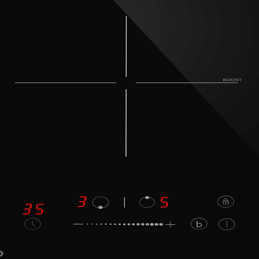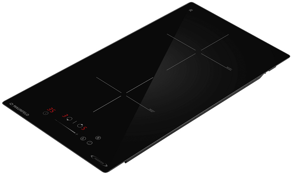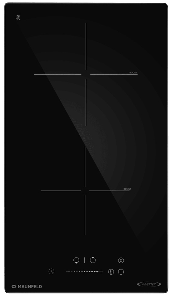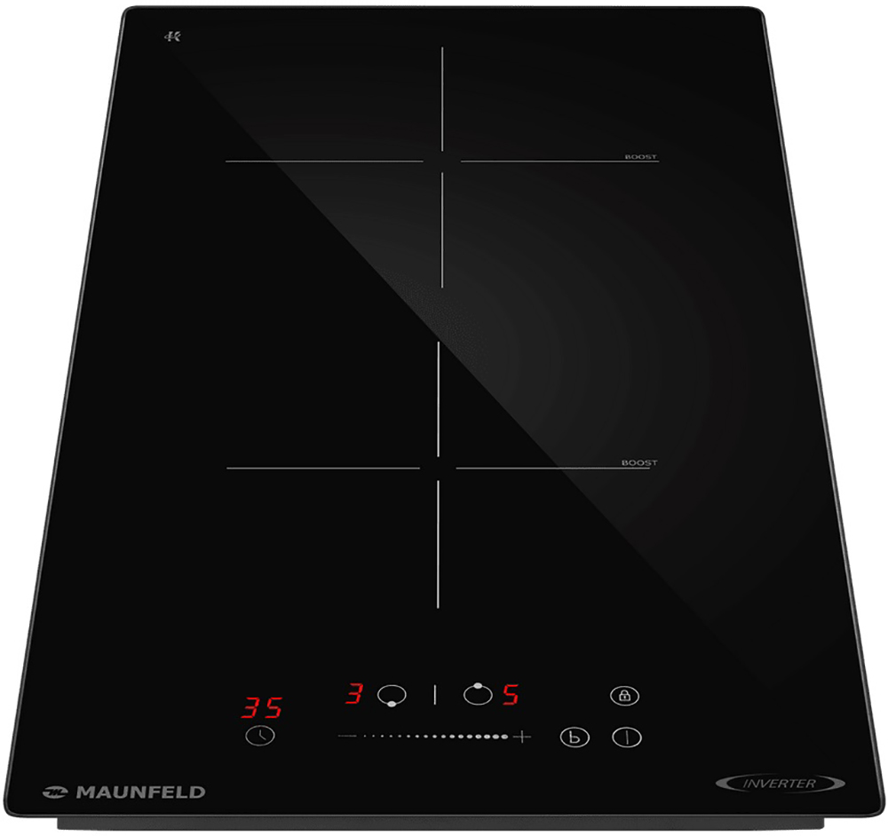 Варочная панель работает на индукционном нагреве — это значит, что повышается температура непосредственно посуды, в которой готовится блюдо. Таким образом промежуточная ступень с предварительным нагревом конфорки пропускается — сокращается время, повышается безопасность. Количество конфорок в этой модели: 2.