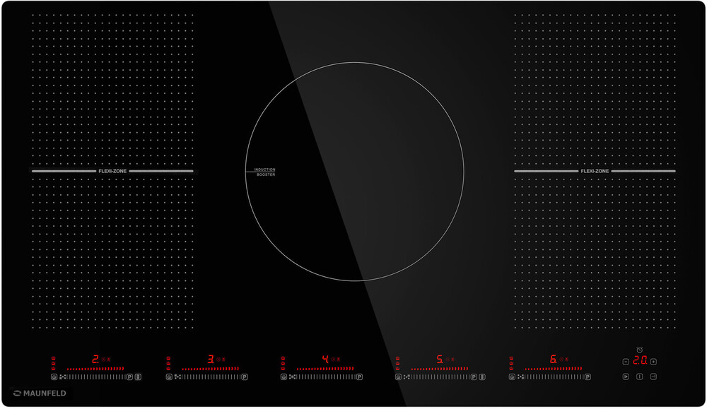 Варочная панель работает на индукционном нагреве — это значит, что повышается температура непосредственно посуды, в которой готовится блюдо. Таким образом промежуточная ступень с предварительным нагревом конфорки пропускается — сокращается время, повышается безопасность. Количество конфорок в этой модели: 5.