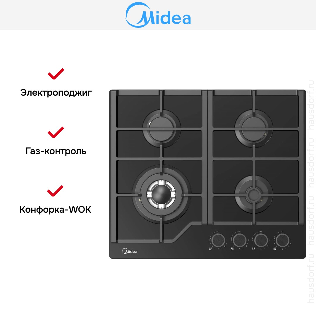 Варочная панель Midea MG697TGB — надежная и эстетичная газовая модель, выполненная в глубоком черном цвете с безрамочным оформлением, что придает ей современный и лаконичный вид. Серая фурнитура создает тонкий контраст, подчеркивая сдержанную элегантность дизайна и гармонично вписываясь в различные кухонные интерьеры.