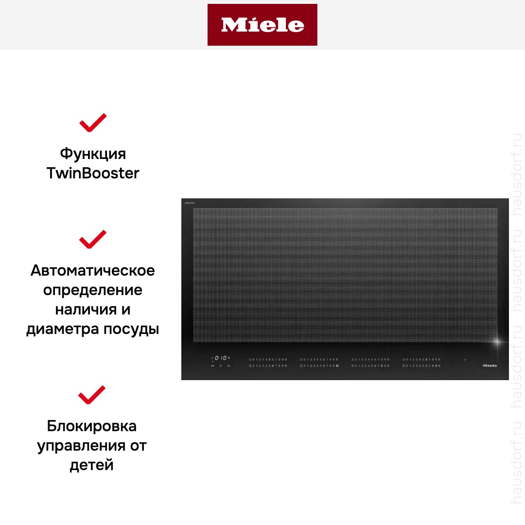 Варочная панель Miele KM 7897-1 FL Diamond — это индукционная варочная панель премиум-класса, созданная для тех, кто ценит передовые технологии, безупречный дизайн и максимальный контроль над процессом приготовления. Модель относится к категории независимых варочных панелей, что позволяет размещать её в любом удобном месте кухонного гарнитура без привязки к духовому шкафу. Её увеличенная ширина — 93,6 см — при компактной высоте 5,1 см и глубине 52 см обеспечивает просторную зону приготовления, идеально подходящую для одновременного использования нескольких крупных посудин. Рекомендуемые размеры ниши (91,6 см в ширину и 50–52,4 см в глубину) гарантируют точную и эстетичную врезку. Панель выполнена в глубоком черном цвете и имеет безрамочное исполнение, что создает эффект цельной гладкой поверхности и визуально расширяет рабочую зону. Такой минималистичный дизайн гармонично вписывается в современные интерьеры, подчеркивая элегантность и технологичность. Управление осуществляется с помощью сенсорных кнопок TouchControl, расположенных спереди, что обеспечивает интуитивно понятное и безопасное управление. Цифровой дисплей отображает все параметры, а функция Stop&Go позволяет временно приостановить приготовление одним касанием и возобновить его позже без потери настроек. Встроенный таймер и индикатор остаточного тепла повышают удобство и безопасность эксплуатации. Индукционная технология обеспечивает мгновенный нагрев, высокую энергоэффективность и точность регулировки температуры, при этом нагревается только дно посуды, а сама поверхность остаётся относительно прохладной. Стеклокерамическое покрытие легко очищается и сохраняет безупречный внешний вид даже при интенсивном использовании. Эта варочная панель станет центральным элементом кухни, где важны инновации, комфорт и безупречное качество.