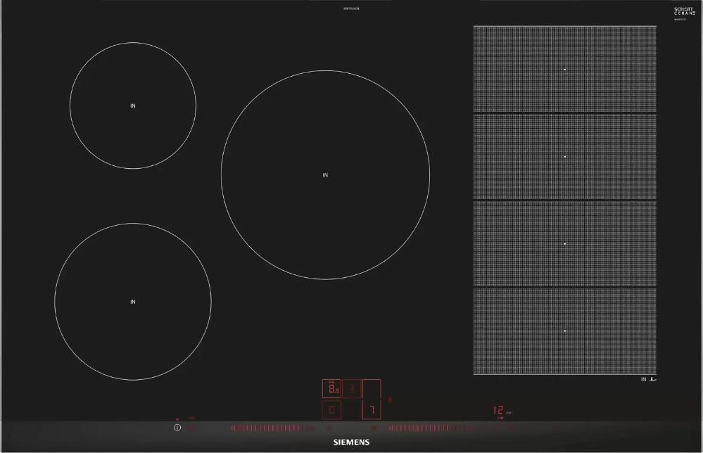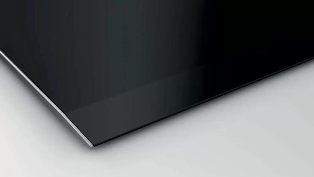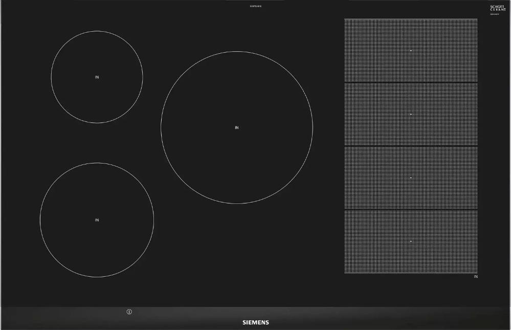 Индукционная варочная панель Siemens EX875LVC1E сочетает строгий минимализм и продуманные инженерные решения. Ее черная безрамочная поверхность из прочной стеклокерамики выглядит идеально в современных кухнях и обеспечивает аккуратный, монолитный вид после встраивания в нишу 78×51 см. При габаритах 5.1×81.2×52 см устройство занимает немного места, а толщина 5,1 см делает его визуально легким и обтекаемым.