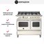 Устройства с тремя духовками также имеют один основной и две дополнительных шкафа разного объема: например, плиты Bertazzoni оснащены большой духовкой объемом 69 литров, средней объемом 54 литра и малой объемом 24 литра. Духовки располагаются в два ряда: две меньшие духовки в одном ряду, большая и ящик для посуды в другом.