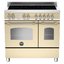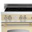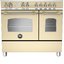 Варочный центр Bertazzoni HER905IMFEDCRT включает в себя индукционную варочную панель из стеклокерамики в металлической рамке на пять зон приготовления и два духовых шкафа — объемом 69 и 38 литров. Это отдельно стоящее устройство бежевого цвета со стальной фурнитурой выполнено в классическом стиле. Аналоговая панель управления духовыми шкафами и варочной поверхностью оснащена поворотными переключателями из металла и аналоговым термометром. Большой духовой шкаф оснащен 11 режимами приготовления, включая гриль, конвекцию, нагрев с кольцевым нагревательным элементом, режим размораживания и выпечки. Он относится к классу энергоэффективности А. Малый духовой шкаф с 6 режимами приготовления имеет класс энергоэффективности А+.
