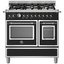 Устройства с тремя духовками также имеют один основной и две дополнительных шкафа разного объема: например, плиты Bertazzoni оснащены большой духовкой объемом 69 литров, средней объемом 54 литра и малой объемом 24 литра. Духовки располагаются в два ряда: две меньшие духовки в одном ряду, большая и ящик для посуды в другом.