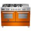 Bertazzoni PRO1206GMFEDART — отдельно стоящий варочный центр шириной 90 см с корпусом оранжевого оттенка и фурнитурой цвета нержавеющей стали. Модель включает в себя газовую варочную панель с шестью зонами нагрева и чугунной решеткой, стальную поверхность теппан для приготовления блюд азиатской кухни, а также два одинаковых электрических духовых шкафа объемом по 69 литров. Варочная панель оснащена двойной WOK-конфоркой мощностью до 5 кВт. Духовые шкафы имеют 4 уровня приготовления и 11 режимов работы. На фронтальной панели управления находятся поворотные переключатели для управления нагревом конфорок и настройками духовки, слева расположен дисплей, отображающий выбранные опции и информацию о времени и температуре.