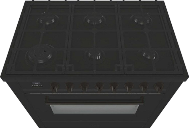 Устройства с тремя духовками также имеют один основной и две дополнительных шкафа разного объема: например, плиты Bertazzoni оснащены большой духовкой объемом 69 литров, средней объемом 54 литра и малой объемом 24 литра. Духовки располагаются в два ряда: две меньшие духовки в одном ряду, большая и ящик для посуды в другом.