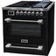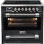 Устройства с тремя духовками также имеют один основной и две дополнительных шкафа разного объема: например, плиты Bertazzoni оснащены большой духовкой объемом 69 литров, средней объемом 54 литра и малой объемом 24 литра. Духовки располагаются в два ряда: две меньшие духовки в одном ряду, большая и ящик для посуды в другом.