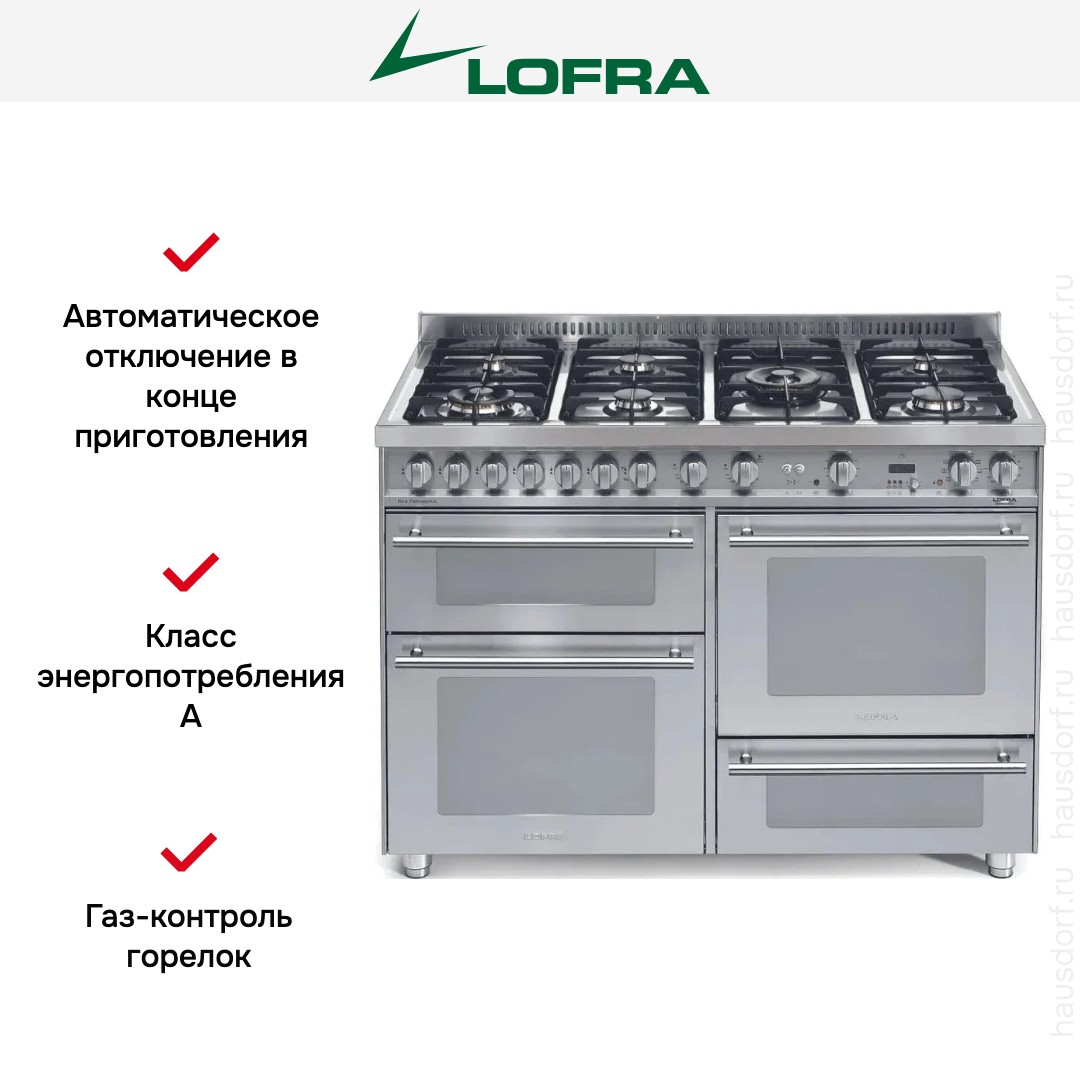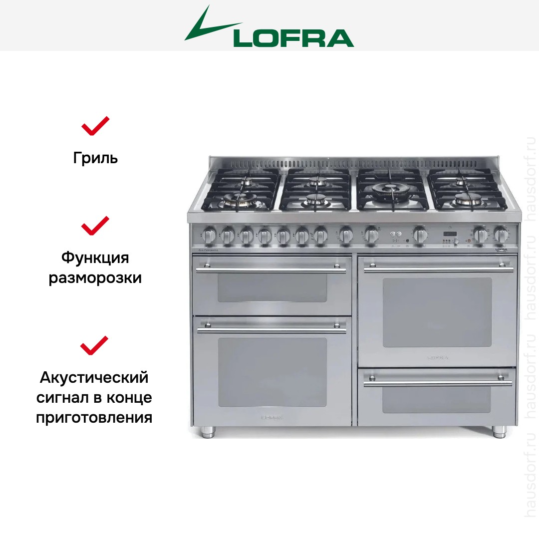 Варочный центр Лофра оборудован несколькими духовками; одну из них можно использовать как основную на постоянной основе, другие как дополнительные. Тип нагрева в камере — электрический. Вместимость составляет 184 л. Размещайте противни на разной высоте в зависимости от режима или желаемого результата. Общее количество уровней: 4. Основные функции, которые уже заложены производителем: Освещение, Работа вентилятора, Верхний и нижний нагрев, Работа верхнего и нижнего нагревательных элементов вместе с вентилятором, Гриль + вертел, Нижний нагрев, Размораживание, Гриль, Большой электрический гриль, Верхний нагрев.