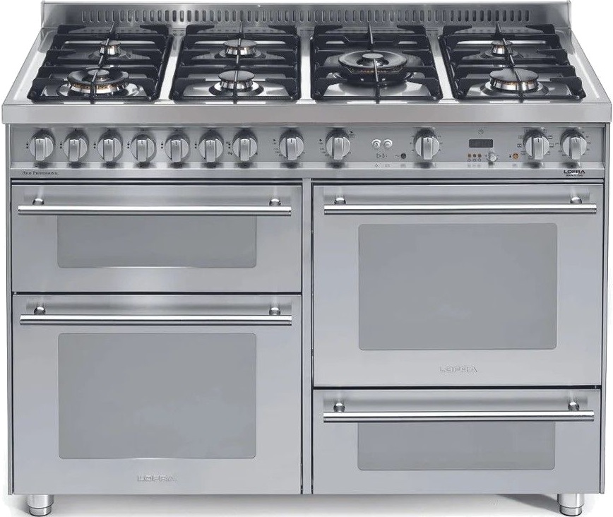 Устройства с тремя духовками также имеют один основной и две дополнительных шкафа разного объема: например, плиты Bertazzoni оснащены большой духовкой объемом 69 литров, средней объемом 54 литра и малой объемом 24 литра. Духовки располагаются в два ряда: две меньшие духовки в одном ряду, большая и ящик для посуды в другом.