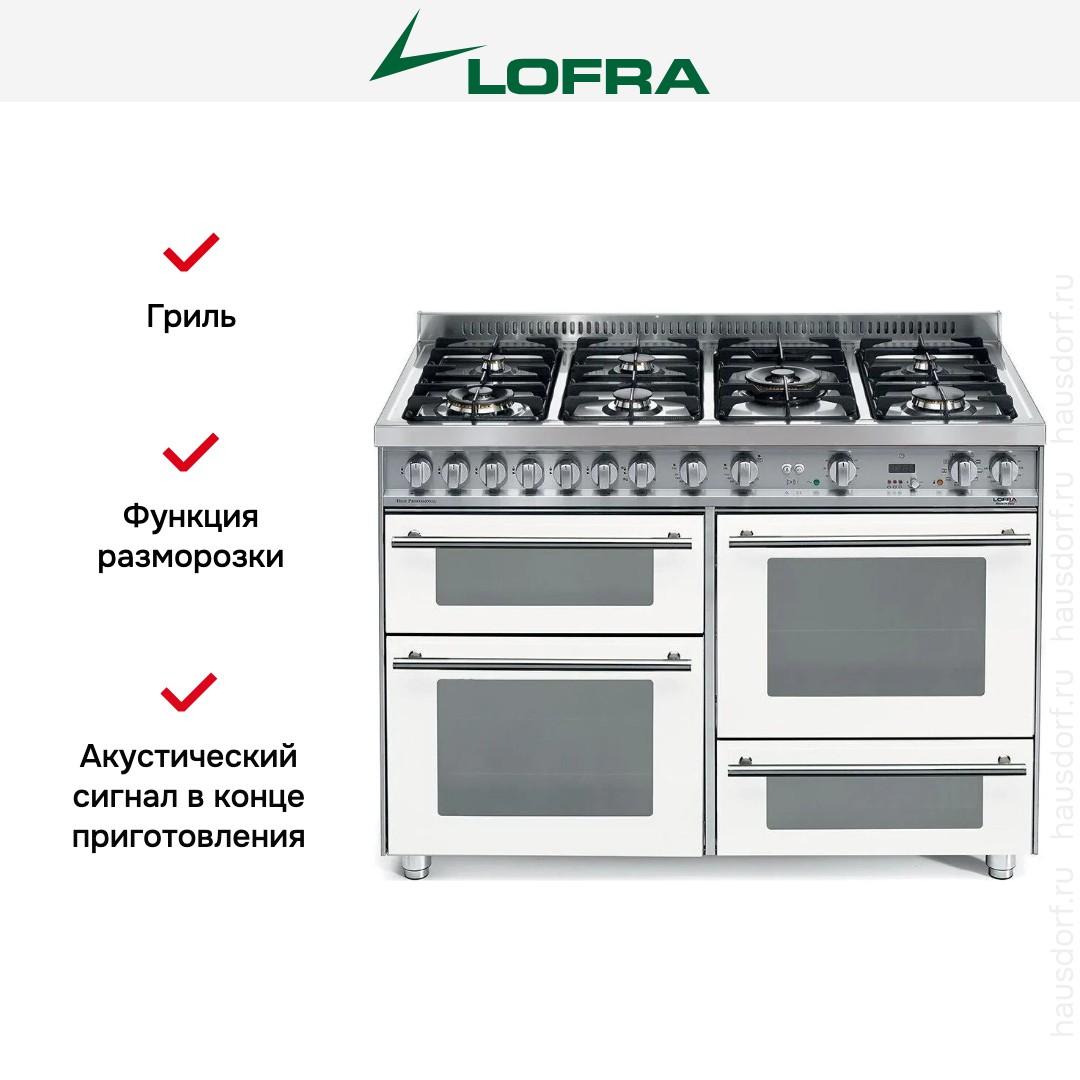 Варочный центр Лофра оборудован несколькими духовками; одну из них можно использовать как основную на постоянной основе, другие как дополнительные. Тип нагрева в камере — электрический. Вместимость составляет 184 л. Размещайте противни на разной высоте в зависимости от режима или желаемого результата. Общее количество уровней: 4. Основные функции, которые уже заложены производителем: Освещение, Работа вентилятора, Верхний и нижний нагрев, Работа верхнего и нижнего нагревательных элементов вместе с вентилятором, Гриль + вертел, Нижний нагрев, Размораживание, Гриль, Большой электрический гриль, Верхний нагрев.
