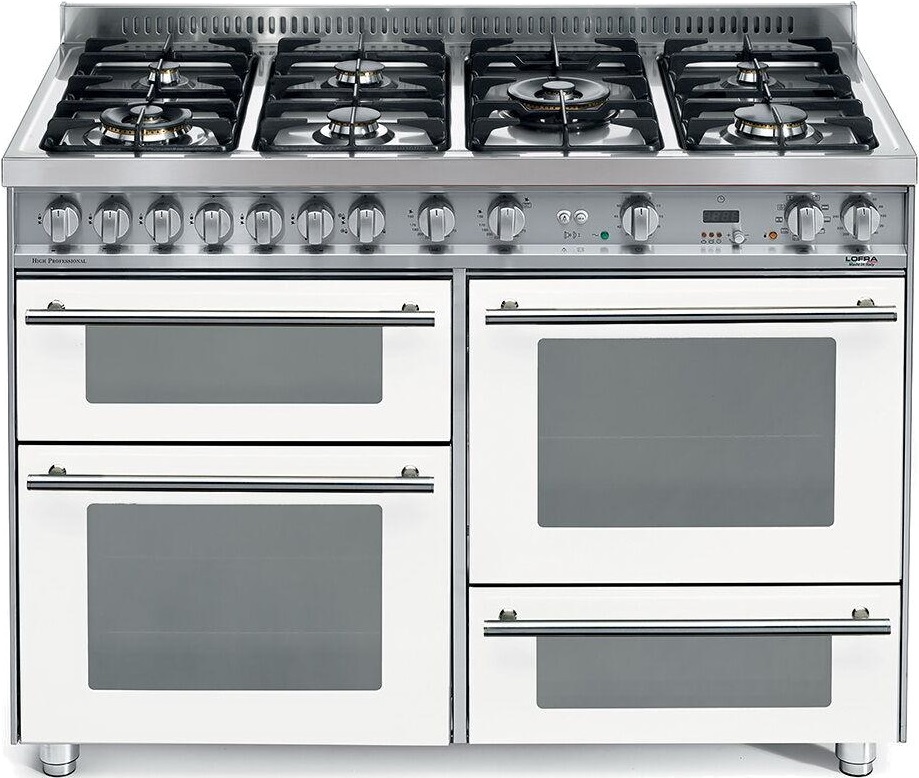 Устройства с тремя духовками также имеют один основной и две дополнительных шкафа разного объема: например, плиты Bertazzoni оснащены большой духовкой объемом 69 литров, средней объемом 54 литра и малой объемом 24 литра. Духовки располагаются в два ряда: две меньшие духовки в одном ряду, большая и ящик для посуды в другом.