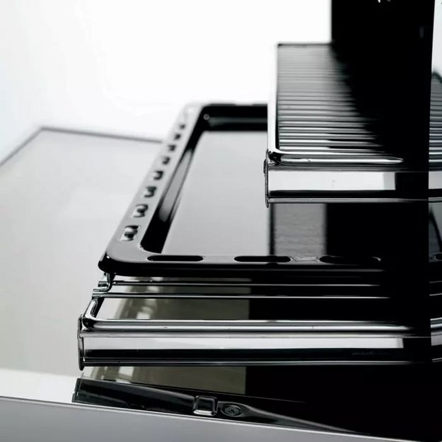 Внутренняя поверхность имеет специальное защитное покрытие: эмаль легкой очистки хорошо аккумулирует и держит тепло, не нуждается в специфическом уходе. Следуйте инструкции для удаления загрязнений — и прибор прослужит вам много лет без повреждений. Продуманная система направляющих для противней предупреждает падение тяжелой посуды при ее загрузке и извлечении: в этой модели используются телескопические элементы.
