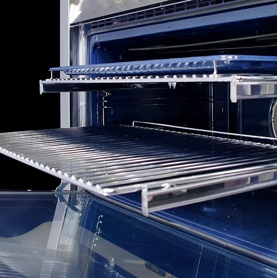 Устройства с тремя духовками также имеют один основной и две дополнительных шкафа разного объема: например, плиты Bertazzoni оснащены большой духовкой объемом 69 литров, средней объемом 54 литра и малой объемом 24 литра. Духовки располагаются в два ряда: две меньшие духовки в одном ряду, большая и ящик для посуды в другом.