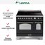Устройства с тремя духовками также имеют один основной и две дополнительных шкафа разного объема: например, плиты Bertazzoni оснащены большой духовкой объемом 69 литров, средней объемом 54 литра и малой объемом 24 литра. Духовки располагаются в два ряда: две меньшие духовки в одном ряду, большая и ящик для посуды в другом.