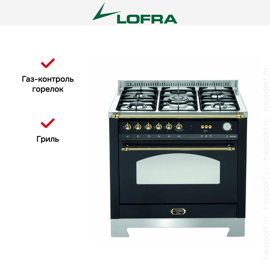 Газовая плита Lofra RNMG96GVGT/Ci Brass — отличный выбор как для квартиры, так и для частного дома. Цвет корпуса черный, он гармонично сочетается с мебелью и техникой похожих оттенков, а также может интересно выглядеть на контрасте с ними. Для управления используется удобная и понятная механическая система. Благодаря ей выбирать режимы приготовления и настраивать параметры температуры очень просто. Переключатели не только выполняют техническую функцию, но и поддерживают общий дизайн; тип элементов: поворотные.