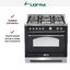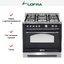 Устройства с тремя духовками также имеют один основной и две дополнительных шкафа разного объема: например, плиты Bertazzoni оснащены большой духовкой объемом 69 литров, средней объемом 54 литра и малой объемом 24 литра. Духовки располагаются в два ряда: две меньшие духовки в одном ряду, большая и ящик для посуды в другом.