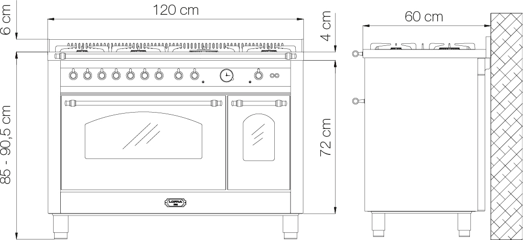 Габариты устройства — от 85 до 90,5 см в высоту, 120 см в ширину и 60 см в глубину — подчёркивают его статус как центрального элемента просторной кухни. Несмотря на внушительные размеры, техника выглядит гармонично благодаря сбалансированным пропорциям и благородной латунной отделке, придающей модели тёплый, слегка винтажный шарм. Подключение к газовой магистрали и электросети гарантирует стабильную работу всех систем, включая электронные таймеры, защиту от перегрева и блокировку от случайного включения.