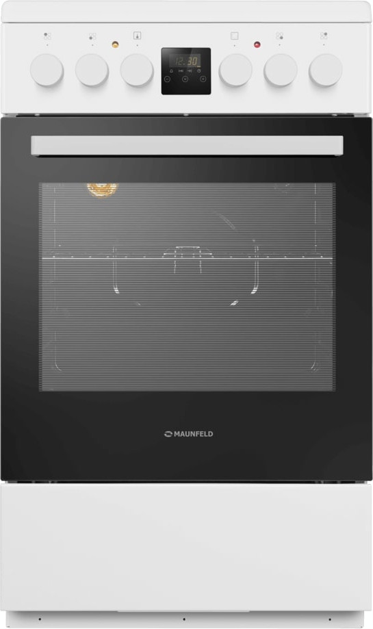 Электрическая плита Maunfeld MEC55CW08D — отличный выбор как для квартиры, так и для частного дома. Цвет корпуса белый, он гармонично сочетается с мебелью и техникой похожих оттенков, а также может интересно выглядеть на контрасте с ними. На внутренней поверхности двери расположена таблица доступных рецептов — полезная и необычная фишка. Для управления используется удобная и понятная электронная система. Благодаря ей выбирать режимы приготовления и настраивать параметры температуры очень просто. Основная информация о процессе отображается на дисплее. Переключатели не только выполняют техническую функцию, но и поддерживают общий дизайн; тип элементов: сенсорные + поворотные.