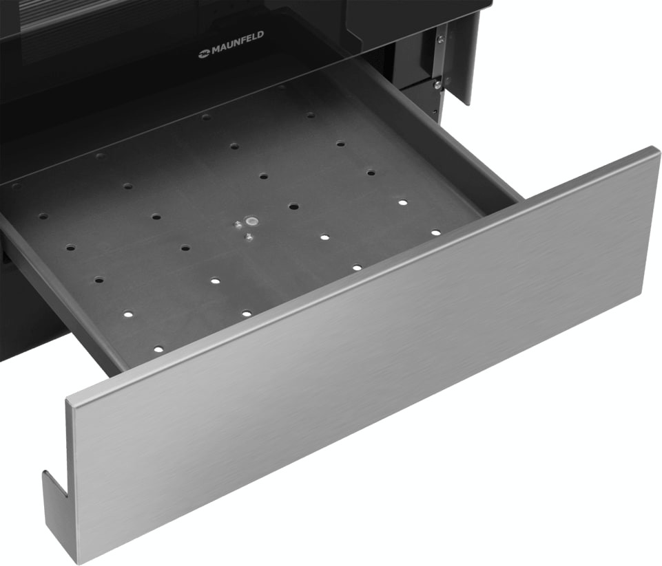 Внутренняя поверхность имеет специальное защитное покрытие: эмаль легкой очистки хорошо аккумулирует и держит тепло, не нуждается в специфическом уходе. Следуйте инструкции для удаления загрязнений — и прибор прослужит вам много лет без повреждений. Продуманная система направляющих для противней предупреждает падение тяжелой посуды при ее загрузке и извлечении: в этой модели используются хромированные элементы. Приятный бонус — специальное отделение для хранения посуды и аксессуаров.