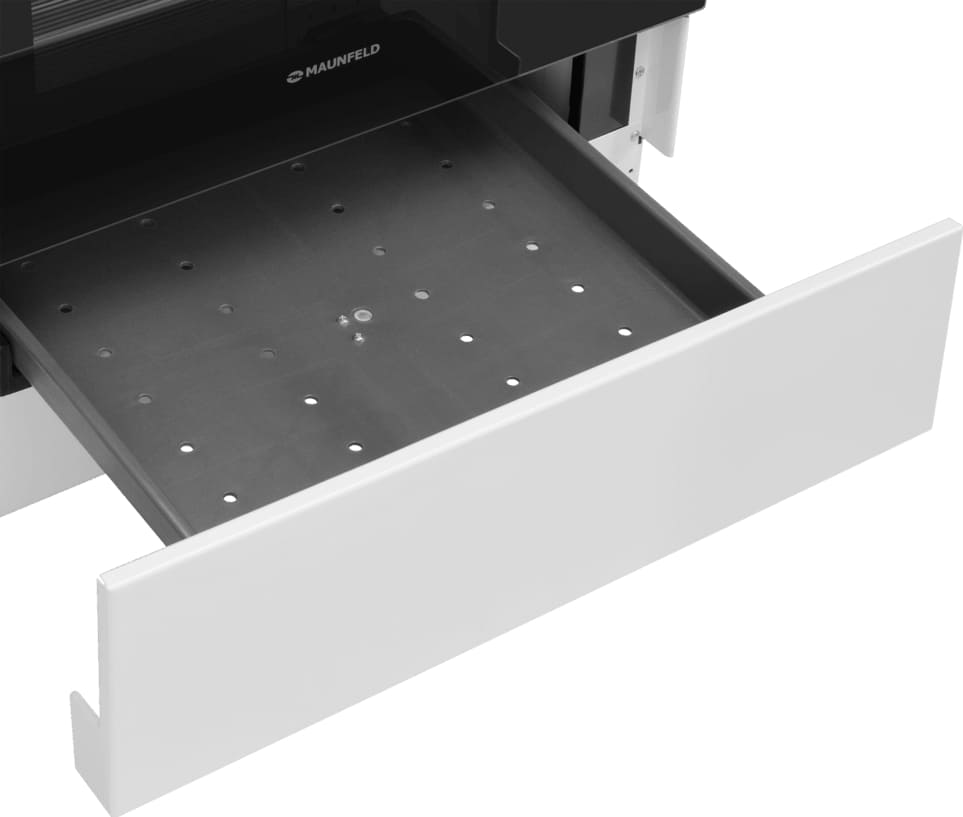 Внутренняя поверхность имеет специальное защитное покрытие: эмаль легкой очистки хорошо аккумулирует и держит тепло, не нуждается в специфическом уходе. Следуйте инструкции для удаления загрязнений — и прибор прослужит вам много лет без повреждений. Продуманная система направляющих для противней предупреждает падение тяжелой посуды при ее загрузке и извлечении: в этой модели используются рельефные элементы. Приятный бонус — специальное отделение для хранения посуды и аксессуаров.