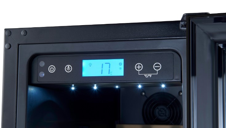 Большинство современных винных шкафов имеет электронное управление, они могут оснащаться обычными цифровыми дисплеями, на которых будет отображаться минимум информации — о включении, температуре в камере и возникших неисправностях. Однако в большинстве моделей используются текстовые сенсорные дисплеи из нескольких сегментов. С помощью кнопок сенсорного меню на этих дисплеях можно отображать и регулировать температуру в каждой зоне отдельно с точностью до градуса, выбирать уровень влажности, задавать дополнительные опции — отключение сигнализации, включение вентиляции и внутреннего освещения, активацию защиты от детей, тип отображения температуры ºF/ºC. Здесь же будут появляться коды ошибок, выданные системой обнаружения неисправностей.
