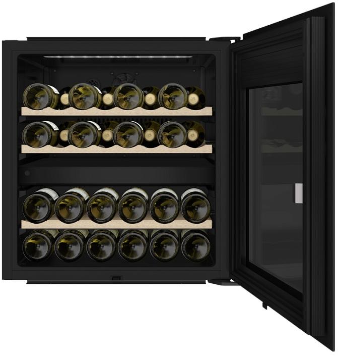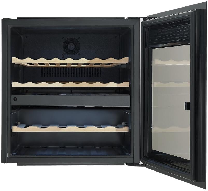 Стеклянная дверь — дополнительный изящный штрих к общему дизайну модели. Специальное покрытие защищает вино от влияния ультрафиолетовых лучей, которые проникают, если шкаф находится в солнечной комнате. Цвет корпуса — черный.