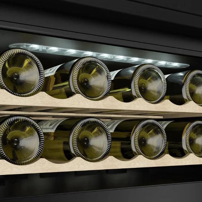 Кнопки для управления подсветкой выносятся на панель управления. Лампы синего, белого или голубого цветов могут располагаться в верхней части камеры или на боковых сторонах. Дополнительное освещение может устанавливаться в винных холодильниках с зоной для сервировки: она обеспечивает лучший обзор и доступ при подготовке вина к подаче.