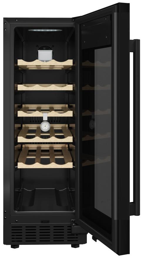 Стеклянная дверь — дополнительный изящный штрих к общему дизайну модели. Специальное покрытие защищает вино от влияния ультрафиолетовых лучей, которые проникают, если шкаф находится в солнечной комнате. Цвет корпуса — черный.