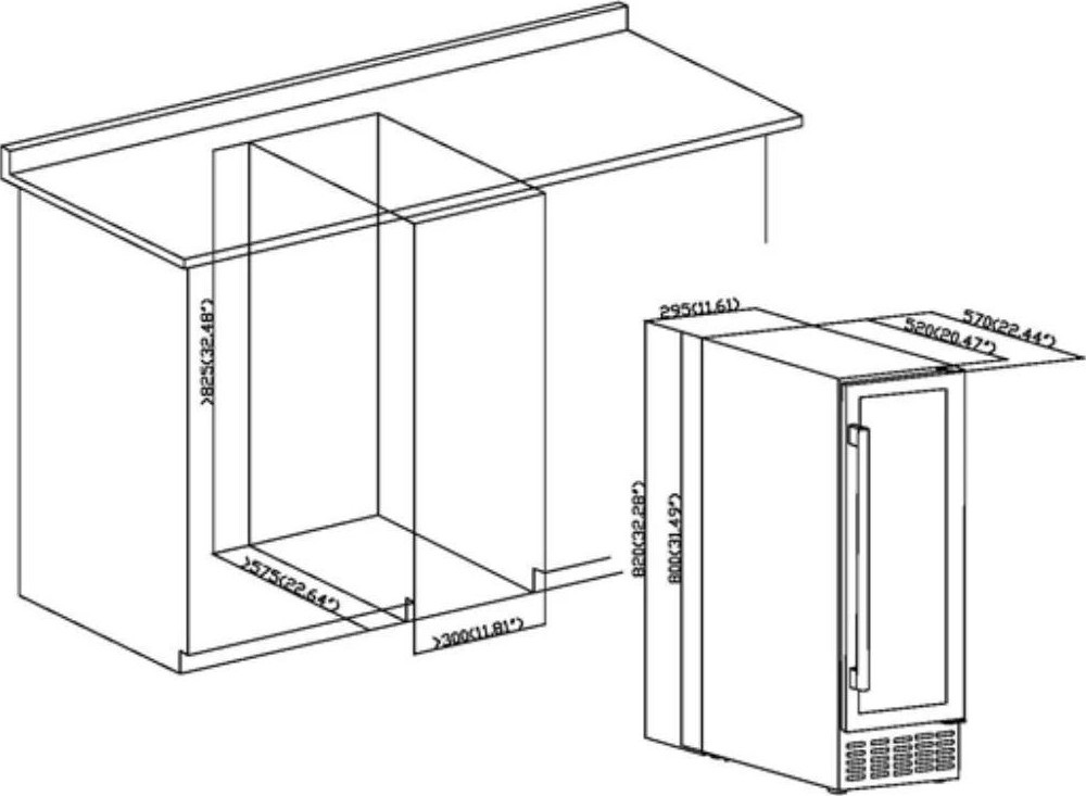 Некоторые отдельно стоящие винные шкафы, а также модели, встраиваемые в мебельную колонну, шкаф или другое закрытое пространство, оснащаются системой забора воздуха и вентиляционной решеткой, расположенными спереди в нижней части корпуса. Зазоры между корпусом шкафа и стенками мебели необходимы и в этом случае.
