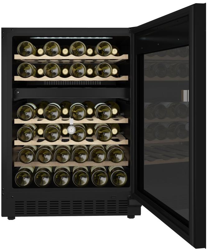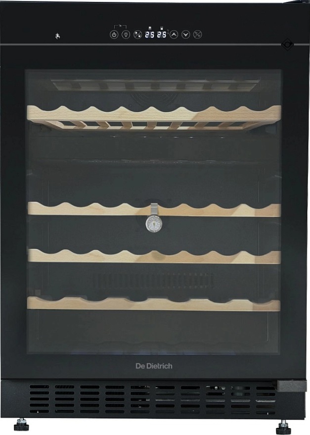 Винный шкаф De Dietrich DUW46DFB выполнен в элегантном дизайне Philharmonie с черной рамкой и стеклопакетом под стеклом, что придает модели строгую презентабельность. Встраиваемый формат с габаритами 82×59.5×57 см обеспечивает аккуратную интеграцию в мебель и экономию пространства. Правосторонний дверной упор и механизм открывания нажатием делают доступ удобным и минималистичным. Регулируемые ножки позволяют выставить прибор строго по уровню, а тёмное стекло защищено от УФ‑излучения и сохраняет эстетичный вид даже при ярком свете.