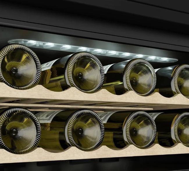 Кнопки для управления подсветкой выносятся на панель управления. Лампы синего, белого или голубого цветов могут располагаться в верхней части камеры или на боковых сторонах. Дополнительное освещение может устанавливаться в винных холодильниках с зоной для сервировки: она обеспечивает лучший обзор и доступ при подготовке вина к подаче.