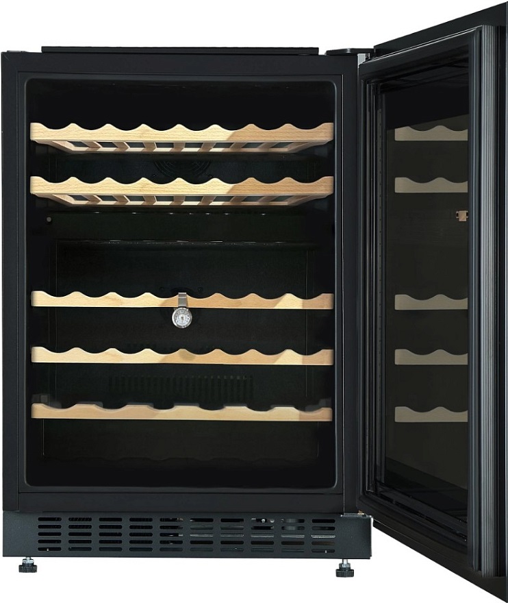 Встраиваемые холодильники для вина оснащаются специальной системой вентиляции: охлаждающая система у них находится в нижней части корпуса спереди. На такие устройства не навешивается мебельный фасад: дверца с затемненным стеклом остается на виду и открывается на достаточно широкий угол для свободного выдвижения деревянных полок.