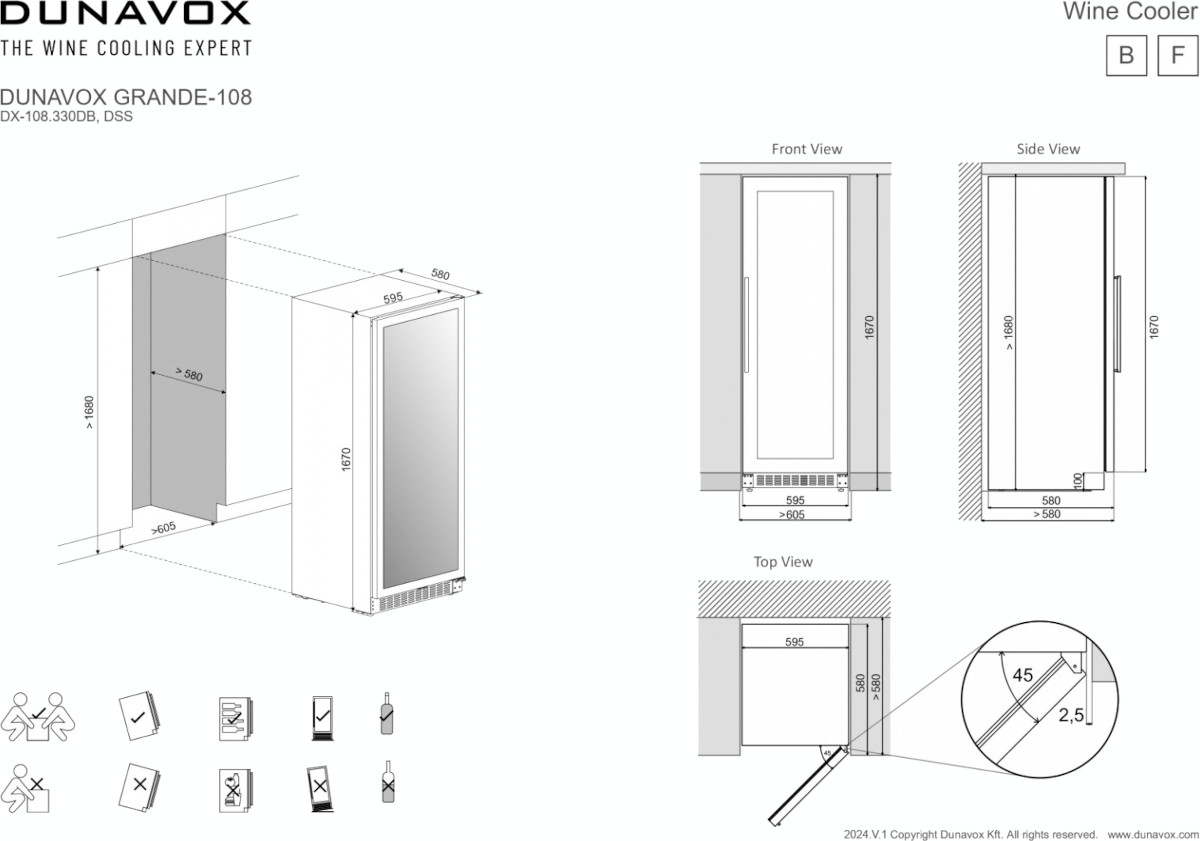 Винный холодильник Dunavox DX-108.330DMB имеет две температурные зоны, в которых одновременно можно хранить разные сорта алкоголя и выставлять разные сочетания настроек. Он устанавливается отдельно, что удобно, если у вас есть специальное помещение — кладовая, погреб и т.д. Количество бутылок, которое можно разместить с учетом полной комплектации и из расчета объема бутылки 0,75 л, — 108 шт.
