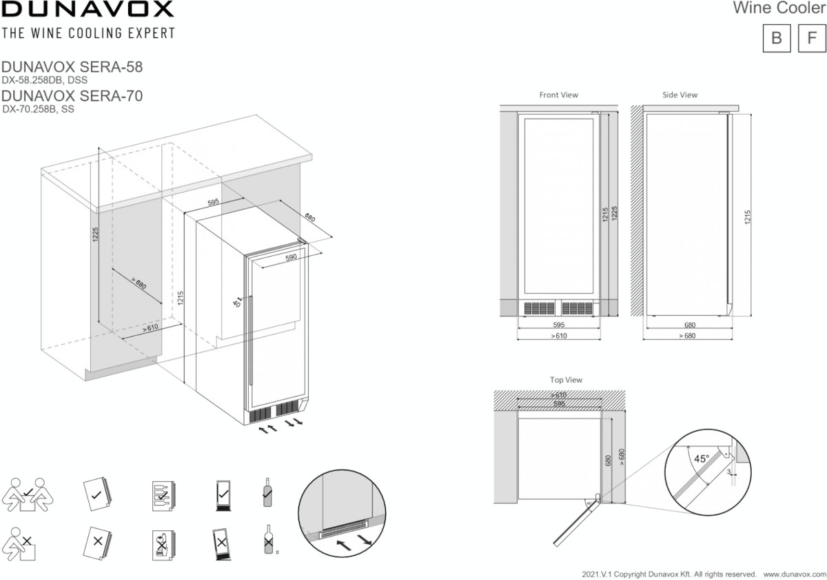 Некоторые отдельно стоящие винные шкафы, а также модели, встраиваемые в мебельную колонну, шкаф или другое закрытое пространство, оснащаются системой забора воздуха и вентиляционной решеткой, расположенными спереди в нижней части корпуса. Зазоры между корпусом шкафа и стенками мебели необходимы и в этом случае.