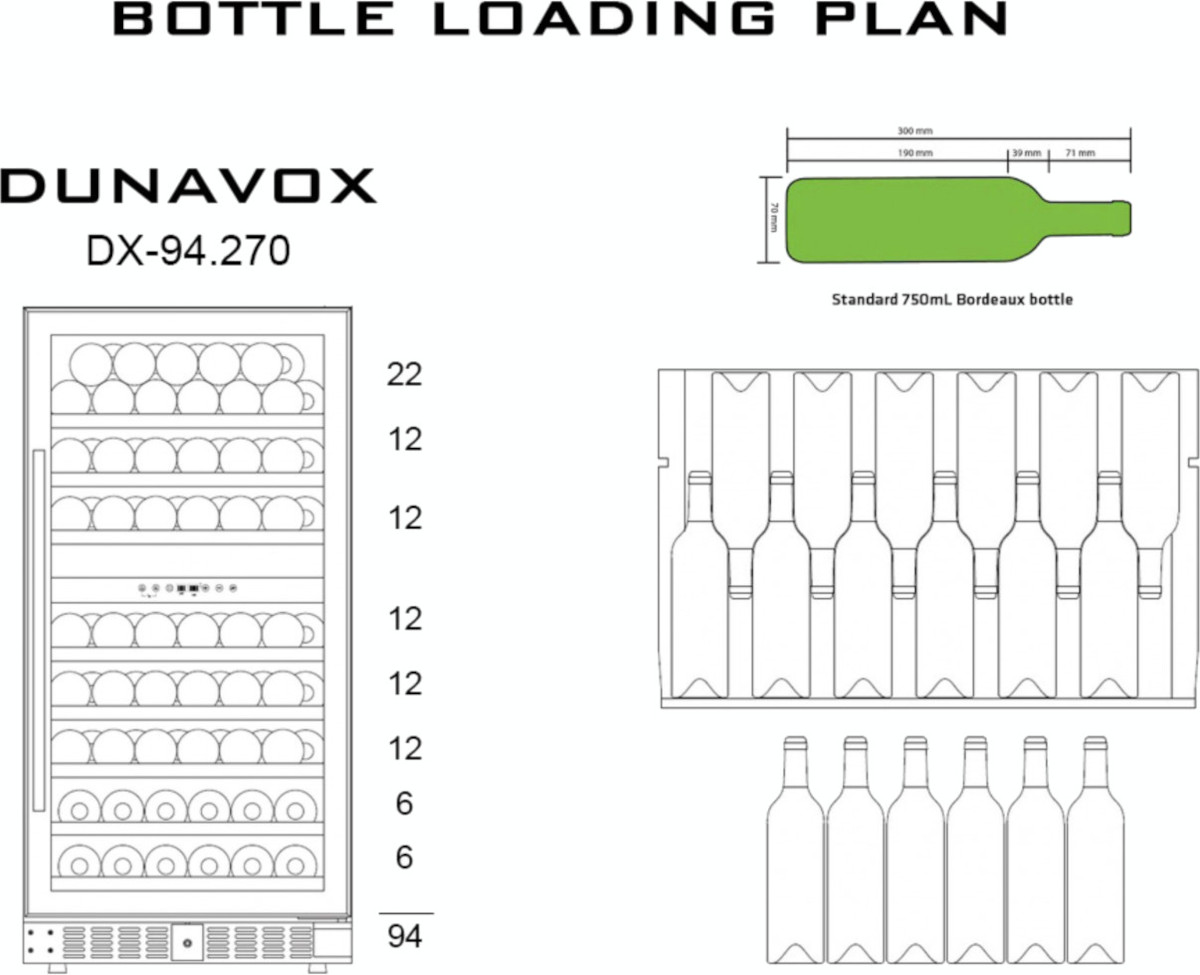 Стандартная вместительность рассчитывается по количеству бутылок «Бордо» 0,75 л. Это число также показывает максимальную загрузку при полной комплектации (полок, ящиков и других элементов).