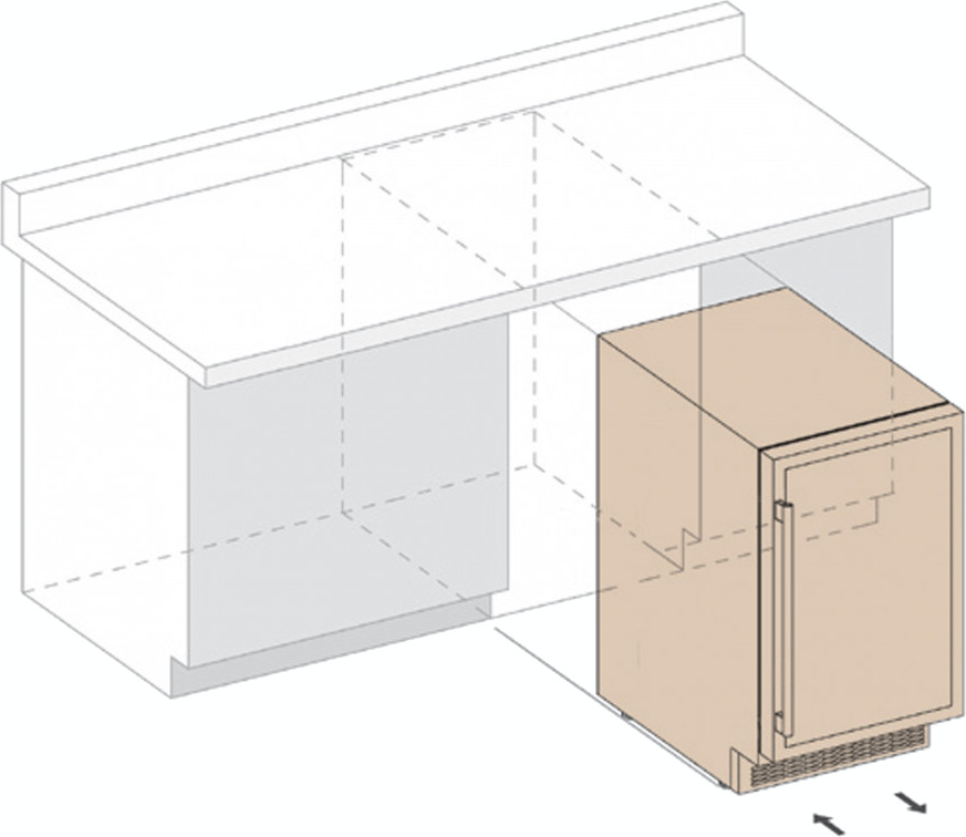 Некоторые отдельно стоящие винные шкафы, а также модели, встраиваемые в мебельную колонну, шкаф или другое закрытое пространство, оснащаются системой забора воздуха и вентиляционной решеткой, расположенными спереди в нижней части корпуса. Зазоры между корпусом шкафа и стенками мебели необходимы и в этом случае.