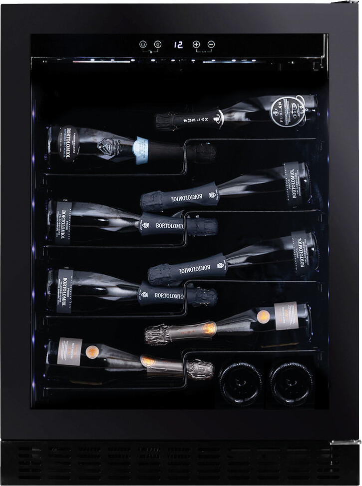 Стеклянная дверь — дополнительный изящный штрих к общему дизайну модели. Специальное покрытие защищает вино от влияния ультрафиолетовых лучей, которые проникают, если шкаф находится в солнечной комнате. Хранение становится еще безопаснее и герметичнее благодаря нескольким слоям стекол. Цвет корпуса — черный матовый. Дверь можно перевесить на другую сторону, поэтому вариантов размещения его в доме становится больше.