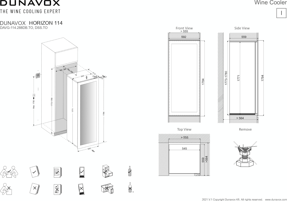 Корпус изготовлен из стали, что придаёт каркасу стабильность и подходит для встраивания «в колонну» в нишу размерами 177.3—178×55.5×55 см. Дверь — трёхслойный стеклопакет в стальной рамке черного цвета с УФ-защитой и тонировкой. Полки выполнены из массива бука, они выдвижные и демонстрационные, что облегчает выкладку бутылок и уменьшает вибрации. В конструкции используется угольный фильтр для очистки воздуха; хладагент — R600A. Масса 93 кг (брутто 108 кг), уровень шума 41 дБ, класс энергопотребления G, годовое потребление 165 кВт·ч.