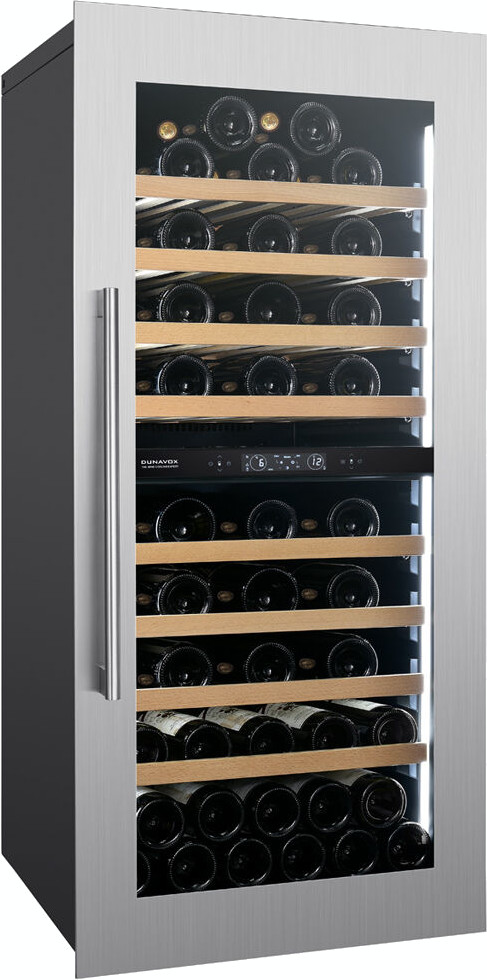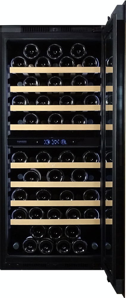 Винный холодильник Dunavox DVS-70.185DC имеет две температурные зоны, в которых одновременно можно хранить разные сорта алкоголя и выставлять разные сочетания настроек. Он встраивается в нишу, что удобно, если у вас ограничен метраж помещения. Количество бутылок, которое можно разместить с учетом полной комплектации и из расчета объема бутылки 0,75 л, — 70 шт.