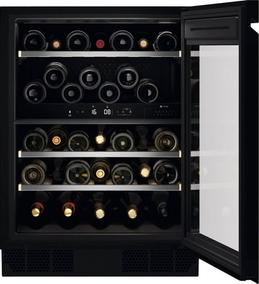 Винный холодильник Electrolux EWUD040B8B имеет две температурные зоны, в которых одновременно можно хранить разные сорта алкоголя и выставлять разные сочетания настроек. Он встраивается в нишу, что удобно, если у вас ограничен метраж помещения. Благодаря компактным размерам данная модель — отличный выбор для офиса, гостиничного номера. Количество бутылок, которое можно разместить с учетом полной комплектации и из расчета объема бутылки 0,75 л, — 40 шт.