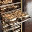 Встраиваемые холодильники для вина оснащаются специальной системой вентиляции: охлаждающая система у них находится в нижней части корпуса спереди. На такие устройства не навешивается мебельный фасад: дверца с затемненным стеклом остается на виду и открывается на достаточно широкий угол для свободного выдвижения деревянных полок.